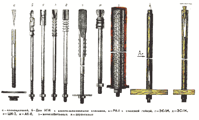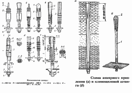 Самые простые – клинощелевые, представляют собой металлическую штангу или деревянный стержень на одном конце которых имеется прорезь, в которую вставляется клин. Закрепление штанги или стержня производят ударами молотка по другому концу, клин упирается в дно шпура и заклинивает анкер. Нужно строго соблюдать длину и диаметр шпура, так как при перебуре закрепить штангу не удается.