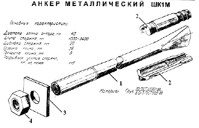 Металлический замковый анкер состоит из стержня 1 с резьбой на одном конце и клиновой головкой (лопаткой) на другом, двух полумуфт 2, опорной шайбы 3 и натяжной гайки 4. Полумуфты надеваются на клиновую часть стержня, стержень с полумуфтами вставляется в установочную трубу, вместе с трубой вводится в шпур через отверстие в верхняке и ударами молотка по концу трубы расклинивается замок (полумуфты набиваются на клиновую часть стержня). Затем надевают шайбу и завинчивают натяжную гайку, притягивая верхняк к кровле. Анкер может воспринимать нагрузку сразу после установки.