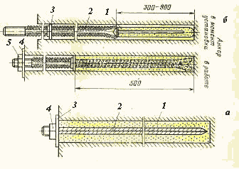 Состоит из стального стержня 2, цементного раствора 1, опорной шайбы 3 и натяжной гайки 4. Наибольшее распространение получили забивные анкера, стержни которых забивают в шпуры после нагнетания в них раствора. Через 3-5 часов к концам анкеров устанавливают опорные шайбы или подхваты и производят их натяжение.