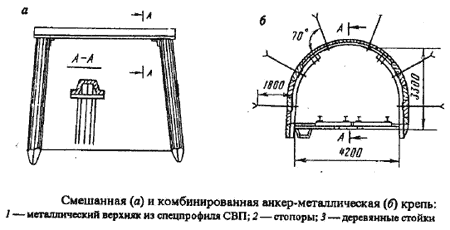 Смешанные называют крепи, несущие элементы которых выполнены из различных крепежных материалов. Это металлический верхняк и деревянный стойки, или металлический верхнях и трубчатые ж/б стойки и пр.
