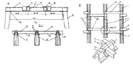 а) трапециевидная рамная смешанная крепь с верхняком из шахтного профиля СВП и межрамными соединениями: 1- верхняк; 2- стойки крепи; 3- межрамные соединения;4- ограничитель смещения стоек; 5- элемент межрамного соединения; 6- соединительный элемент межрамного соединения; 7- бобышка фиксации положения межрамного соединения.