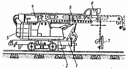 | Тюбингоукладчик 1-колесный ход; 2- поворотная платформа; 3-противовес;4-телекопическая стрела; 5- домкрат подьема стрелы; 6-таль. |