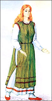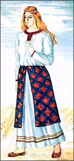 28. Верхней одеждой была запона — накладная одежда типа нарамника из полотна, не сшитая по бокам. Запона также была короче рубахи. Ее носили с поясом и скалывали внизу (рис. 8). Нагрудник — более короткая верхняя одежда с широкими короткими рукавами украшалась по низу, горловине и рукавам. Ее также носили поверх рубахи (рис. 9).
