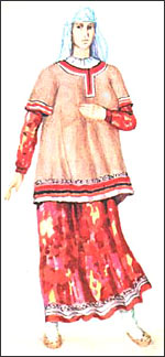 26. Женская рубаха была длинной, до ступней, с длинными, собранными в низках рукавами и разрезом, из горловины застегивающимся на пуговицу. По горловине, разрезу, низкам рукавов ее украшали вышивкой или обшивали полосой отделочной ткани. Рубашку шили из белого полотна или цветного шелка и носили с поясом.
