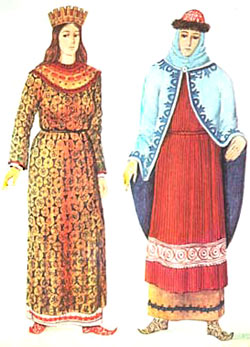 32. В женском костюме феодальной знати, кроме рубашки, были византийские формы одежды: туники, далматики, драпирующиеся плащи (рис. 10). Верхней женской одеждой были свиты с более широкими, чем в мужских, рукавами, из которых виднелись украшенные зарукавья сорочки.