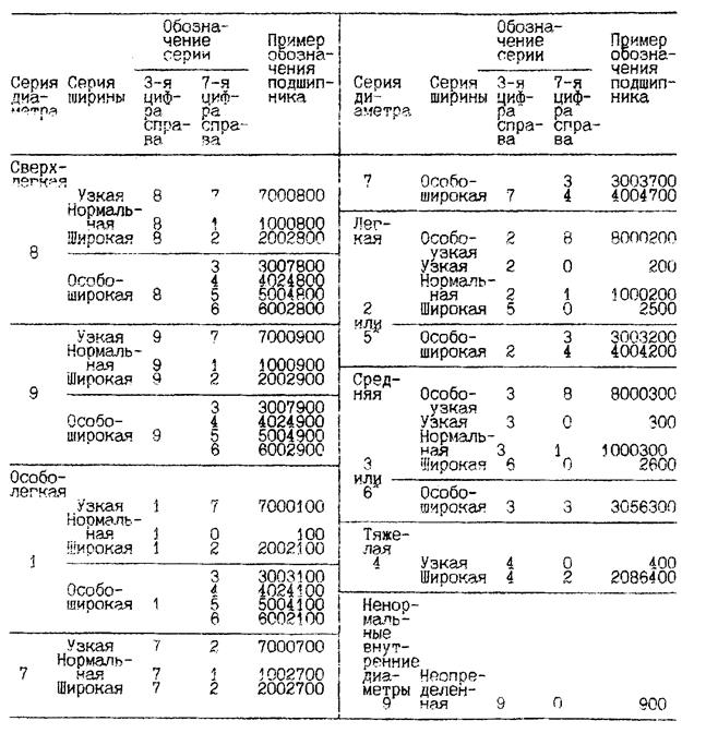 Совместно с седьмой цифрой справа, используемой для обозначения серии по ширине подшипника, третья цифра определяет размерную серию подшипника по диаметру (см. табл. 1).