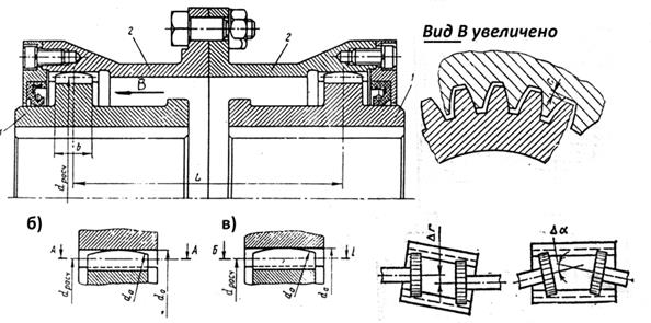 Зубчатая муфта состоит из двух полумуфт 1 с наружными зубьями и двух половин обоймы 2 с внутренними зубьями, сцепляющимися с зубьями полумуфт. Смещение соединяемых валов компенсируется за счет: