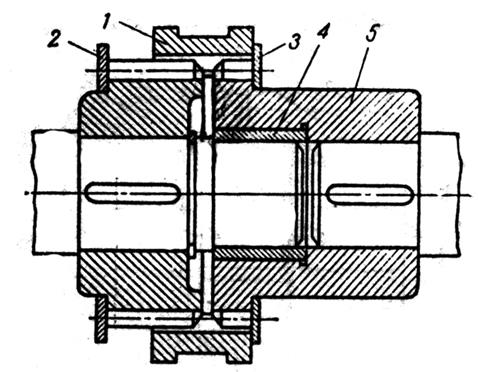 (рис. 4.1) с той лишь разницей, что здесь, обойма 1 изготавливается подвижной и управляется с помощью отводки. На рис 5.2 обойма расположена в положении «включено». Диски 3 и 2 являются ограничителями, а втулка 4 центрирует валы и одновременно выполняет функцию подшипника при их относительном вращении (когда муфта включена).