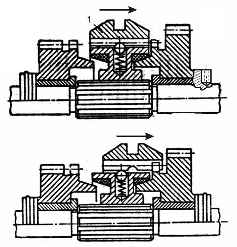 При перемещении обоймы 1 с внутренними зубьями вправо или влево она через шарик передает осевую силу конусной полумуфте синхронизатора и сцепляет её с конусной полумуфтой одной из шестерен. Проскальзывание, которое наблюдается при включении, позволяет плавно разгонять ведомые элементы, происходит выравнивание угловых скоростей ведущего вала и ведомой шестерни. После преодоления сопротивления пружины фиксатора обоймы и смещения фиксирующих шариков внутрь муфты дальнейшим перемещением обоймы включается зубчатая муфта.