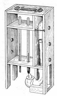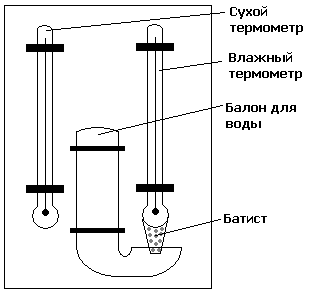 Прибор состоит из двух спиртовых термометров. Резервуар одного обернут тонкой материей, конец которой опущен в дистиллированную воду. Через 10-15 минут наблюдения снимают показания с сухого и влажного термометров. По разнице показаний по таблице определяют относительную влажность воздуха.