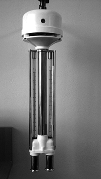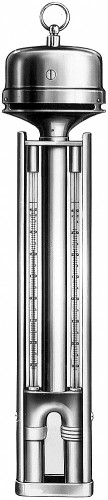 Ртутные термометры заключены в металлические трубки, через которые равномерно просасывается исследуемый воздух с помощью заводного вентилятора, который находится на верхней части прибора. Резервуар влажного термометра обернут кусочком батиста, который перед наблюдением смачивают дистиллированной водой. Через 5 минут от начала работы снимают показания термометров и по таблице определяют относительную влажность воздуха.