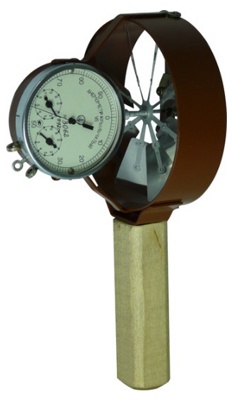 Позволяет определить скорость движения воздуха от 1 до 50 м/с. Верхняя часть состоит из крестовины с четырьмя полыми полушариями, обращенными выпуклостью в одну сторону. Нижний конец оси с крестовиной соединен с измерительным прибором. Становятся лицом к ветру, измерительное устройство должно быть обращено к наблюдателю. Записывают показания прибора, т.е. положение стрелок на циферблате, указывающих количество метров, начиная с тысяч (первая малая стрелка), затем - сотен (вторая малая стрелка) и единиц(большая стрелка). Чашечки вращаются вхолостую 1-2 мин., затем одновременно включают счетчик анемометра и секундомер. Через 5-10 мин.счетчик выключают и записывают новые показания стрелок. Разница в показаниях стрелок между отсчетами покажет число метров, пройденных воздушным потоком за период наблюдения.