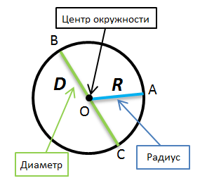 - Отрезок, который соединяет две точки окружности и проходит через её центр, называется диаметром окружности. Диаметр окружности обозначается буквой D. На рисунке выше - это отрезок BC.