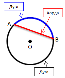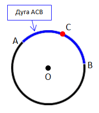 На рисунке ниже отметим на окружности две точки A и B. Эти точки делят окружность на две части, каждую из которых называют дугой. Это синяя дуга AB и черная дуга AB. Точки A и B называют концами дуг.