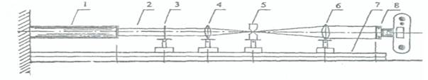 Все элементы установки монтируются на скамье (7). Исследуемый документ или негатив (3) помещается на одной оптической оси между лазером (1) и фокусирующей линзой (4), за которой располагаются фильтр пространственных частот (5) и линза (6), преобразующая дифракционный спектр. Приемником изображения служат белый экран, фотоматериал или телекамера (8).
