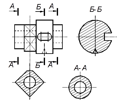 Задание «Сечения» выполняется на формате А4. Перед выполнением задания необходимо изучить ГОСТ 2.305-68, раздел «Сечения». Перечертив задание по варианту – две детали: вал и деталь с фасонным профилем, следует выполнить необходимые сечения. Так как размеры в задании не указаны, допускается самостоятельно определять глубину отверстий, ширину пазов и т.д.