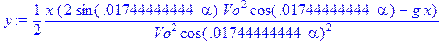 > y:=1/2*x*(2*sin(alpha*3.14/180)*Vo^2*cos(alpha*3.14/180)-g*x)/Vo^2/cos(alpha*3.14/180)^2;