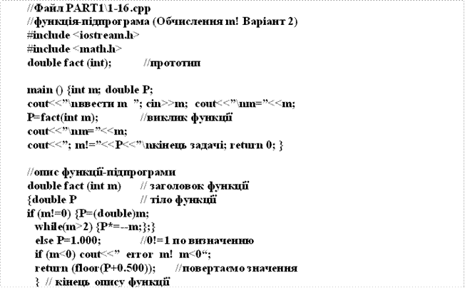 Функція-підпрограма є програмним блоком, який повторюється у програмі або в різних програмах. Перетворимо програму PART1\1-14 так, щоб власний розрахунок m! виділити в окрему функцію-підпрограму з ім’ям fact (factorial – факторіал). Підбираючи функції потрібно переконається, що воно не зустрічається в заголовних файлах, включених в програму.
