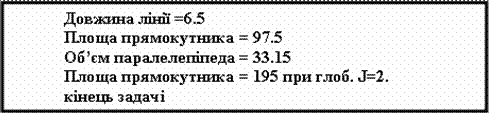 У програмі є підпрограма, у котрій два аргументи (другий та третій) задаються у прототипі. Можливі три варіанта виклику функції: з першим аргументом, з першим та другим аргументами або з трьома аргументами. У першому випадку задається перший аргумент, а два останні використовують значення за замовчуванням – функція притому обчислює довжину лінії. У другому випадку задається перший аргумент і змінюється другий, а третій використовує значення за замовчуванням, - функція обчислює площу прямокутника. У третьому випадку задаються значення трьох аргументів, - функція обчислює об’єм паралелепіпеду. Аргументи, що задані за замовчуванням, повинні записуватися праворуч від звичайних, тобто не ініціалізовані і обов’язково задані при виклику функції, та пере назначаються тільки підряд зліва на право.
