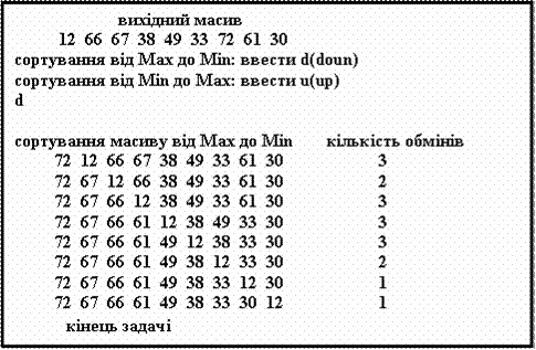 Сортування від max до min здійснюється за таким алгоритмом. Перший елемент масиву (індекс 0) позачергово порівняється зі всіма наступними елементами. Коли якійсь елемент більш першого, то вони за допомогою програми swap міняються місцями і процес продовжується. У результаті обміну всіх елементів найбільший елемент масиву стає на першу позицію (з індексом 0).