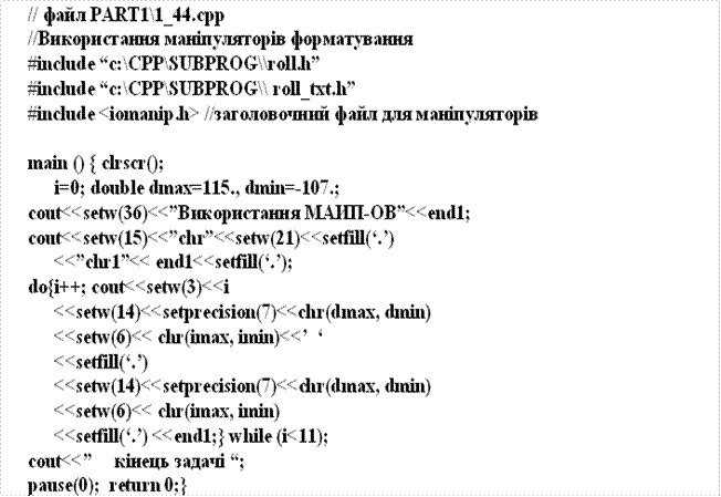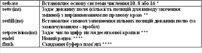 Розглянемо один із можливих в С++ способів форматування виводу – за допомогою маніпуляторів. Перелік найуживаніших маніпуляторів розглянутий у табл.1.3.