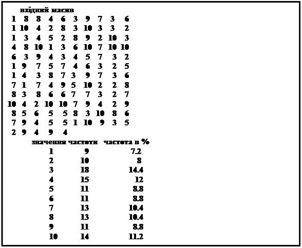 Маємо масив цілих чисел int ms[size], що заданий розміром (size=М). Можна припустити, що це результат опитування size респондентів, які вибирають одна з N відповідей на питання. Треба визначити частоту кожного із N чисел у масиві ms.