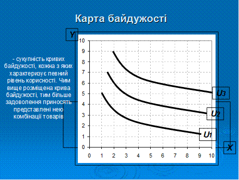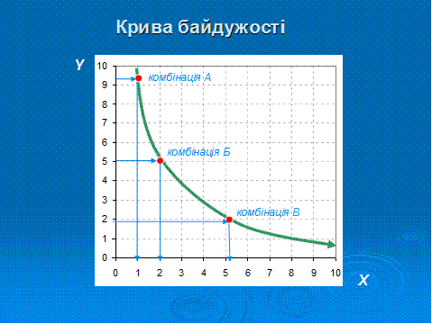 Крива байдужості - лінія, всі точки якої показують різні комбінації (набори) двох благ (товарів), що мають рівну (однакову) корисність для даного споживача. Крива байдужості відображає аналіз бажань або уподобань споживача. На кривій можна побачити комбінацію, що показує, від якої кількості товару У слід відмовитись, щоб отримати одну додаткову одиницю товару X при незмінній загальній величині корисності для споживача.