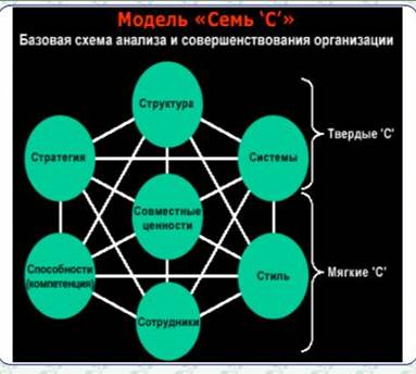 Название модели происходит от семи факторов, которые компания McKinsey считала наиболее важными в контексте развития организации: стратегия, способности, соединяющие ценности, структура, системы, сотрудники и стиль.