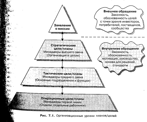 Понятия целей и планов — неотъемлемая часть жизни любого общества. Цель — это желаемое состояние будущего, достичь которого и пытается организация. Значение целей определяется тем, что каждая организация существует ради некоего результата, а цели позволяют как определить его, так и довести информацию до сотрудников и общества. План является «маршрутом» движения организации к поставленным целям, включающим в себя схемы распределения ресурсов, различные графики, промежуточные задачи. Цели — это «маяк», конечные результаты; планы — «корабль», имеющиеся в распоряжении на текущий момент средства. Термин планирование объединяет «маяк» и «корабль»; это процесс определения целей организации и средств их достижения.