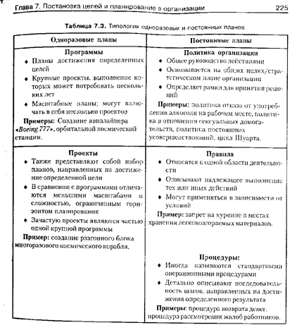 К одноразовым планам относятся в основном различные программы и проекты. Наиболее важные постоянные планы — это политика организации, принятые в ней правила и процедуры относительно таких аспектов ее деятельности, как заболевания работников, отсутствие на рабочем месте, курение, дисциплина, найм, увольнение.