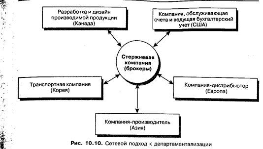 Новейший подход к департаментализации — так называемая «динамическая сетевая» организация. Сетевая структура означает, что организация дезагрегирует свои основные функции (производство, инжиниринг, продажи, бухгалтерия и финансы) между отдельными работающими по контрактам компаниями и компаниями, в качестве брокера (посредника) которых выступает небольшая головная организация. Организационная схема гипотетичес ыми преимуществами функциональной структуры