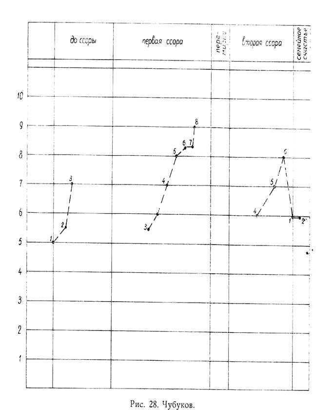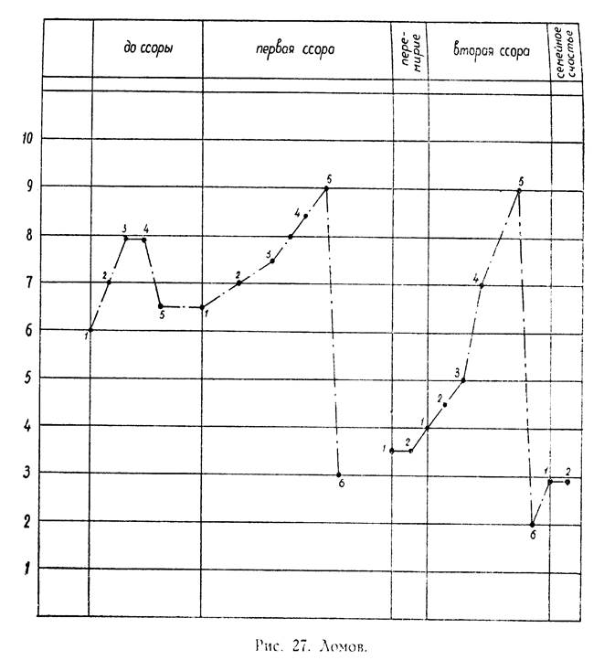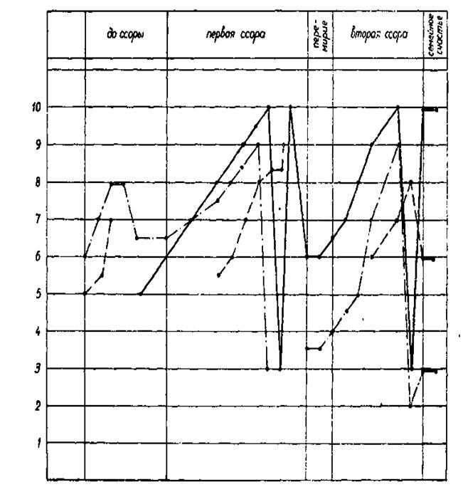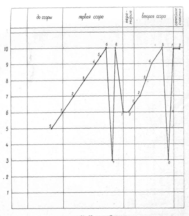 На вертикальной линии слева условно дано 10 делений для указания подъемов и спусков «кривой». Среднее, 5-е деление — это более или менее уравновешенное, спокойное ритмическое самочувствие. Горизонтальная линия вверху разделена на 5 частей, носящих условные названия: До ссоры; Первая ссора; Перемирие; Вторая ссора; Семейное счастье.