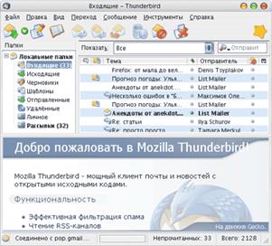 Інтерфейс Mozilla Thunderbird, а також структура меню і налаштувань багато в чому нагадує браузер Mozilla Firefox. Mozilla Thunderbird - єдиний поштовий клієнт, в якому можна відображати всі облікові записи як в одній групі папок, так і в окремих групах. Простота і інтуїтивність налаштувань зіпсута одним фактом - процедуру введення пароля облікового запису зроблено за принципом браузера. При першому зверненні до сервера пропонується ввести пароль, який треба запам'ятати. Надалі до налаштувань паролів можна буде дістатися лише з розділу приватності. Подібний механізм не застосовується в поштових клієнтах і може викликати ускладнення у новачків.