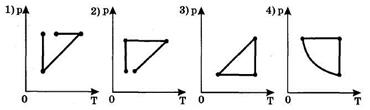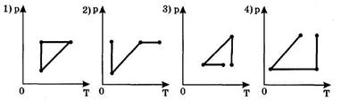 30. Идеальный газ сначала охлаждался при постоянном давлении, потом его давление увеличивалось при постоянном объеме, затем при постоянной температуре давление газа уменьшилось до первоначального значения. Какой из графиков в координатных осях рТ соответствует этим изменениям состояния газа?