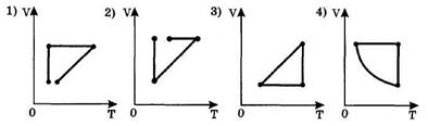 32. Идеальный газ сначала нагревался при постоянном давлении, потом его давление уменьшалось при постоянном объеме, затем при постоянной температуре объем газа уменьшился до первоначального значения. Какой из графиков в координатных осях VТ соответствует этим изменениям состояния газа?