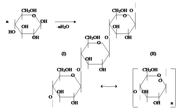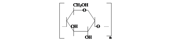 Химическими и физическими методами установлено, что целлюлоза, по структуре представляет собой полисахарид, состоящий из разветвленных нитей длиной около 1570нм, построенных из остатков b-Д-глюкопиранозы, соединенных как в дисахариде целлобиозе, a-1,4-глюкозидными связями. Таким образом вследствие выделения молекулы воды за счет a-гликозидного гидроксила и гидроксила при 4-ом углеродном атоме следующего глюкопиранозного кольца (формула I или сокращенная формула II) образуется макромолекула целлюлозы: