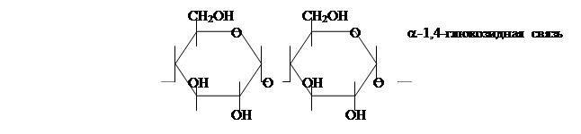 Макромолекулы крахмала построены по типу дисахарида мальтозы и представляет собой полигликозид, полимерные цепочки которого состоят из колец a-Д-глюкопиранозы, соединенные a-1,4-гликозидными связями, возникшими при отщеплении молекул воды за счет гликозидного гидроксила и гидроксила при 4-ом углероде кольца a-Д-глюкопиранозы. Таким образом макромолекула крахмала изображается структурой: