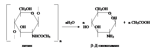 Хитин - название происходит от греческого хитон - покрытие. Хитин относится к азотсодержащим биополимерам, родственным полисахаридам. По структуре хитин является N-ацетилгликозамином, мономерные кольца в котором соединены b-1,4-гликозидными связями. При полном гидролизе хитина получается гликозамин и уксусная кислота: