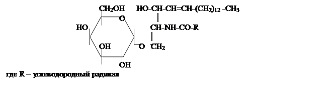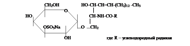 Цереброзиды – липиды, молекулы которых состоят из остатков жирных кислот, гексоз и сфингозина. Их строение может быть представлено следующей формулой:
