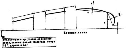 - базовая линия от начала (конца) следа разбивается на отрезки одинаковой длины, например, равные 1 м (при разбивке базовой линии на отрезки меньшей длины точность нанесения следа будет большей). Длина отрезков должна быть указана. При равной длине всех отрезков достаточно указать длину первого;