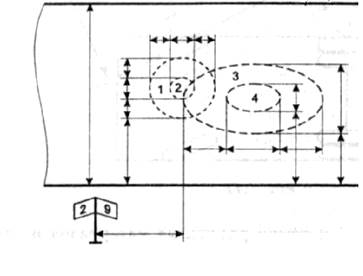 Пример нанесения на схему границ осыпей осколков ветрового стекла и осколков фарных рассеивателей: 1-осыпь фарных стекол; 2-ядро осыпи фарных стекол; 3-осыпь ветрового стекла; 4-ядро осыпи ветрового стекла