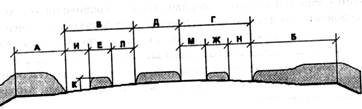 А,Б-обочины; ВГ-левая и правая полосы движения; Д-межполосное пространство; И,Л,М,Н-колея; Е,Ж-межколейное пространство; К-глубина колеи