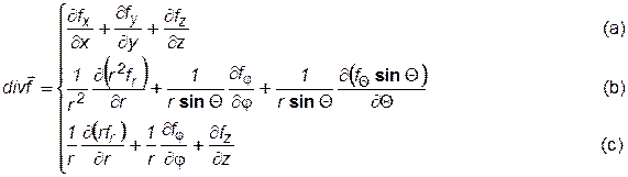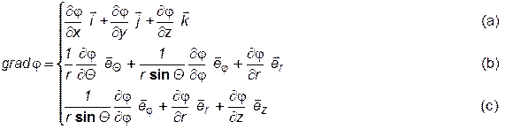 (a) – декартовые координаты; (b) – сферические координаты; (c) – цилиндрические координаты; i, j, k – единичные векторы по осям декартовой системы координат; e Q, e j, er, ez – по осям сферической системы; Q, j, r и z – по осям цилиндрической системы; в сферических координатах – угол Qопределяет изменение меридианного угла, а угол j – широтного.