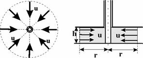 Траектории всех частиц жидкости – прямолинейные горизонтальные прямые, радиально сходящиеся к центру скважины, а скорости фильтрации во всех точках любого поперечного (перпендикулярного к линиям тока) сечения потока параллельны и равны между собой; изотахи и эквипотенциальные поверхности перпендикулярны траекториям и образуют цилиндрические окружности с осью, совпадающей с осью скважины. Схемы линий тока в любой горизонтальной плоскости потока будут идентичными и для характеристики потока достаточно рассмотреть движение жидкости в одной горизонтальной плоскости.