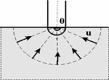 Траектории всех частиц жидкости – прямолинейные горизонтальные прямые, радиально сходящиеся к центру полусферического забоя; эквипотенциальные поверхности перпендикулярны траекториям и образуют сферические поверхности. Скорость фильтрации в любой точке потока является функцией только расстояния этой точки от центра забоя. Следовательно, этот вид фильтрационного потока также является одномерным.