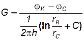 Таким образом, дебит несовершенной скважины можно определить, если известен параметр несовершенства d или приведённый радиус rпр, а также известна соответствующая формула дебита совершенной скважины. Влияние несовершенства скважины на приток при существовании закона фильтрации Дарси можно учесть величиной коэффициента С, основываясь на электрической аналогии. Согласно данной аналогии различие в дебитах совершенной Gc и несовершенной G скважин объясняется наличием добавочного фильтрационного сопротивления несовершенной скважины величиной С/2 p h, т.е. дебит несовершенной скважины можно представить в виде: