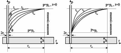 Изменение пьезометрической кривой в различные моменты времени после пуска скважины с постоянным дебитом в пласте с круговым контуром питания показано на рис.4.3а.