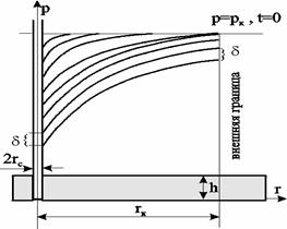 Рис. 4.5. Пьезометрические кривые при пуске скважины в конечном пласте с закрытой внешней границей при постоянном дебите