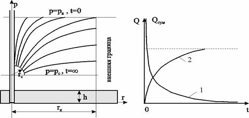 | Рис. 4.6. Пьезометрические кривые при пуске скважины в конечном пласте с закрытой внешней границей при постоянном забойном давлении | Рис. 4.7. Изменение дебита Q (кр.1) скважины и суммарной добычи Qcp (кр.2) с течением времени t |