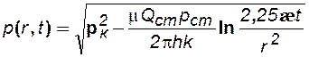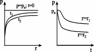 Формулы (4.38),(4.39) определяют при фиксированных значениях времени распределение давления вокруг газовой скважины, работающей с постоянным дебитом с момента t =0. Депрессионные кривые идентичны кривым при установившейся фильтрации – имеют максимальную кривизну вблизи скважины (рис.4.9а). Если задать значение r, то можно найти изменение давления в данной точке с течением времени (рис.4.9b). В частности, можно найти давление на забое (при r=rc) после начала работы скважины.